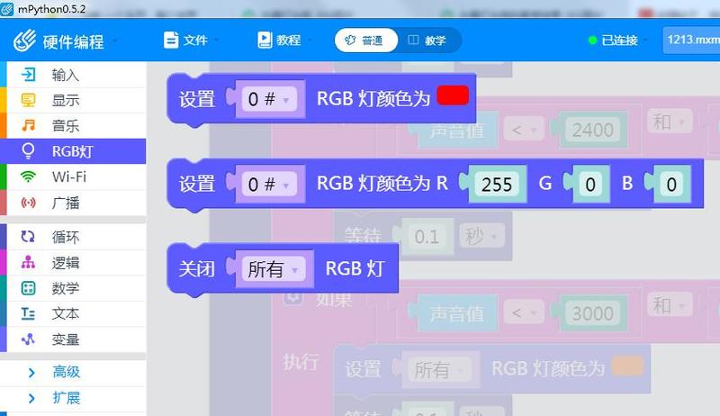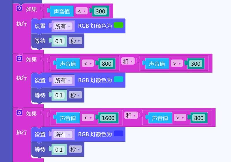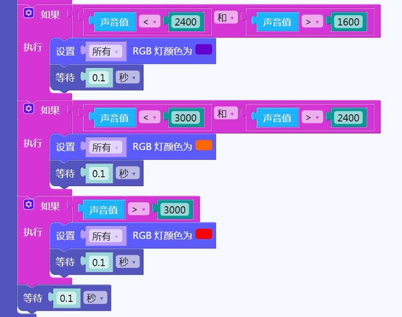 在RGB块中找到设置RGB颜色指令,根据不同声音值,点亮不同颜色的灯光