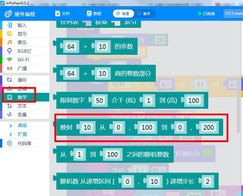左侧数学块中找到映射指令:是指将数值一个范围均匀对应到另一个范围。