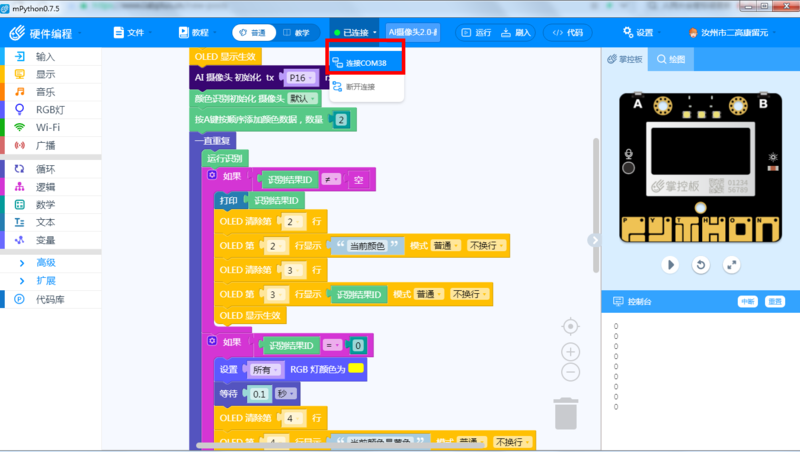 5.刷入程序,右下角观察AI摄像头2.0与掌控板的通讯情况。