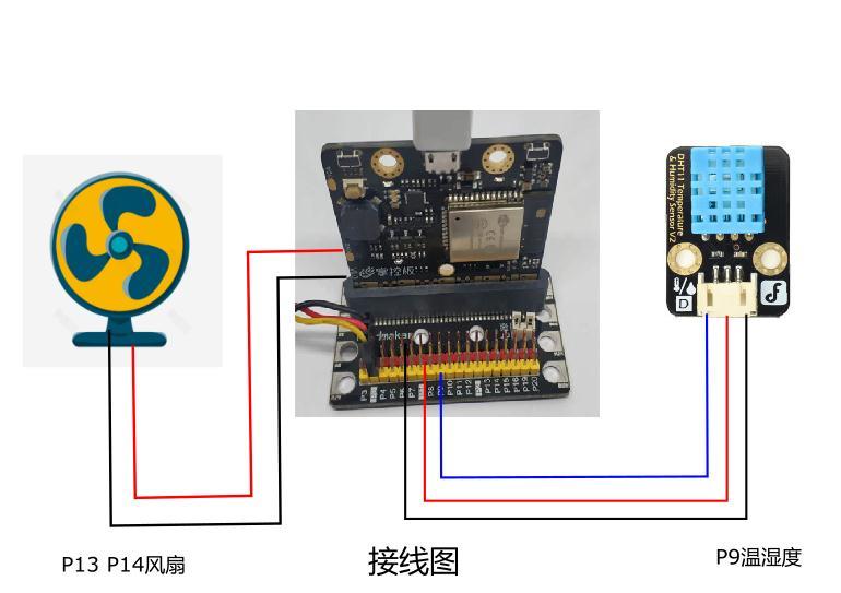 风扇电机接扩展板p13 p14,DHT11温湿度传感器接p9