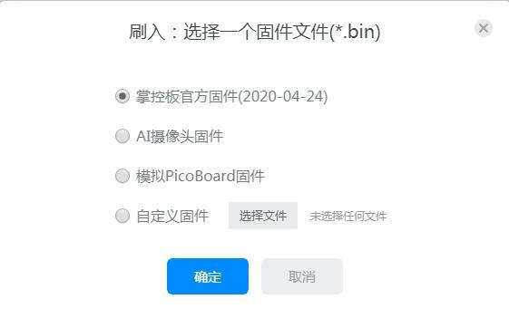 在设置菜单中,烧录最新固件,选择一个固件掌控板官方固件(2020-04-24),确定;