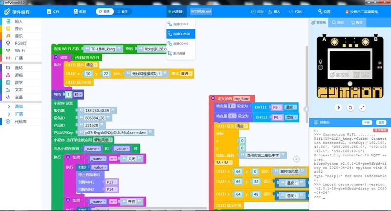 打开mPython软件,在菜单栏切换为“图形模式”下,选择连接设备:串口com20;
