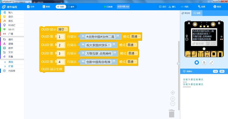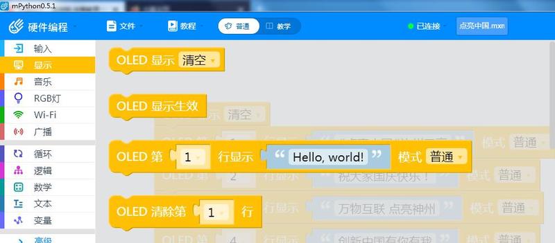 1.打开 mPython0.5.1,在左方【显示】模块,找到 显示块