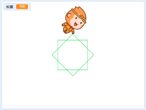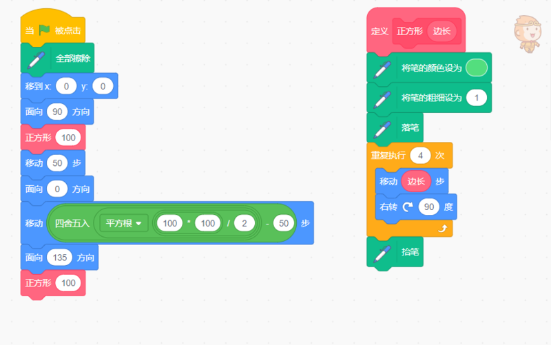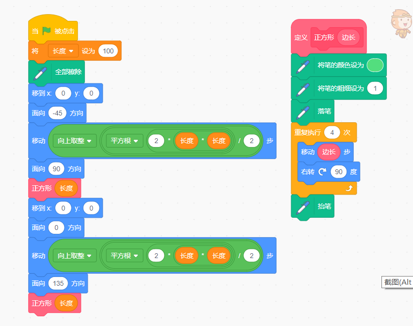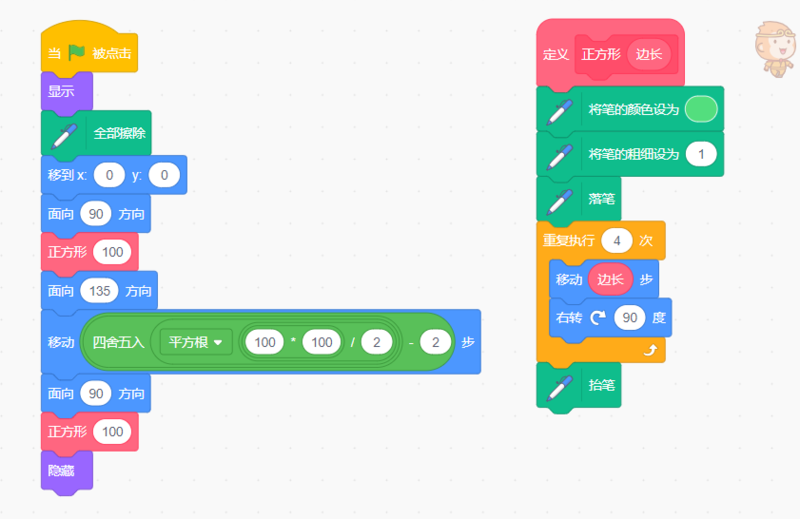 我改一下,用勾股定律计算,可以说明向上走20步的来历,00点面向90度画方,回到00点,向右移动边长一半,向上移动对角线一半减边长一半距离,面向135度画方。