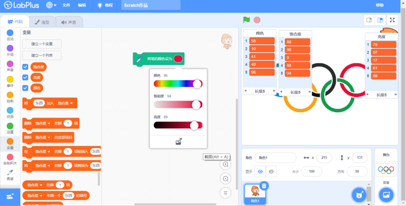 1、导入官网五环图片做背景,用吸管取色,测出五环的颜色、饱合度、亮度,存入三个列表。