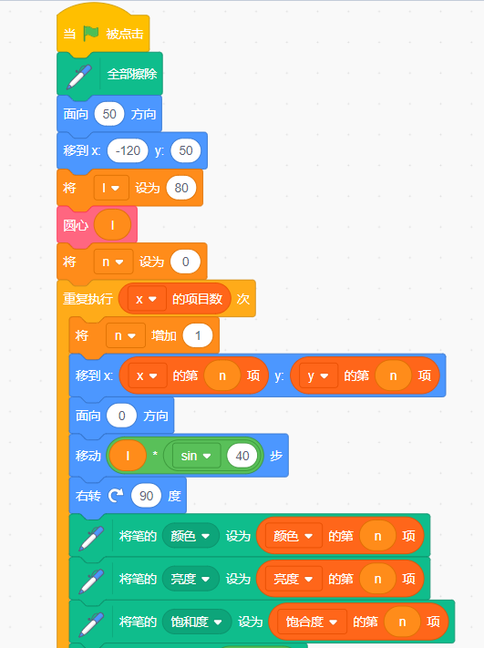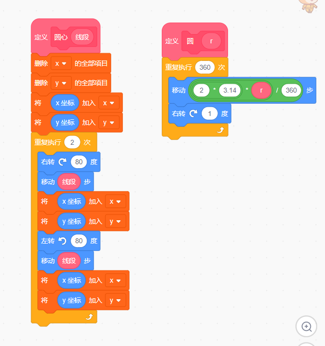 自定义一个积木来做圆心定位,将定位坐标存入列表x,y。