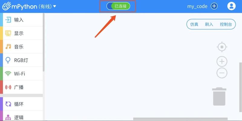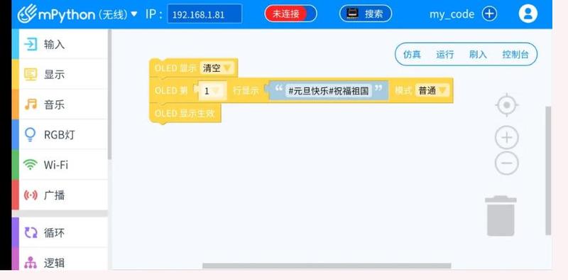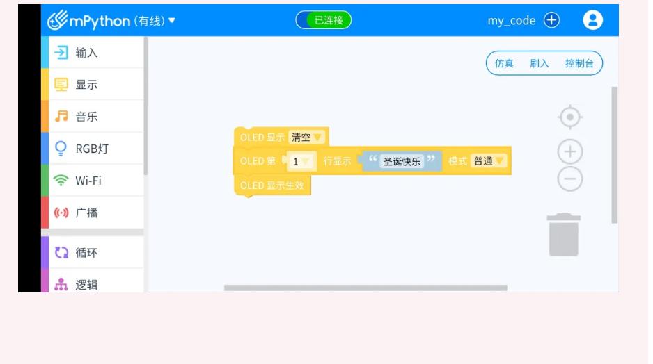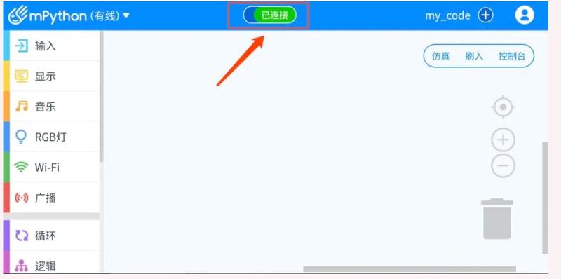 2.连接成功,在左边图形化积木模块区域拖动您需要的积木模块,完成您需要编写的图形化代码,点击刷入,查看效果;