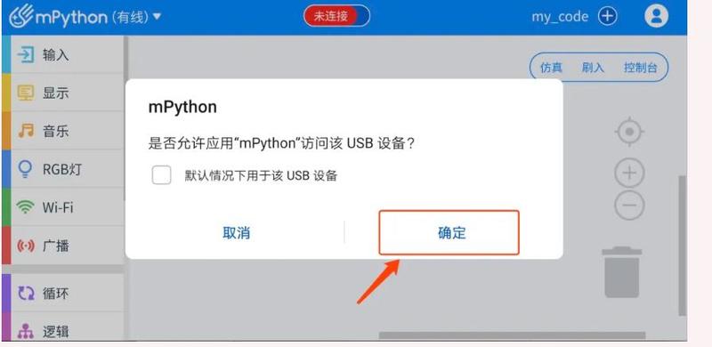 1.使用otg转接头连接手机和掌控板,对弹出的usb授权进行允许,将自动连接掌控板,红色未连接的会切换为绿色已连接。