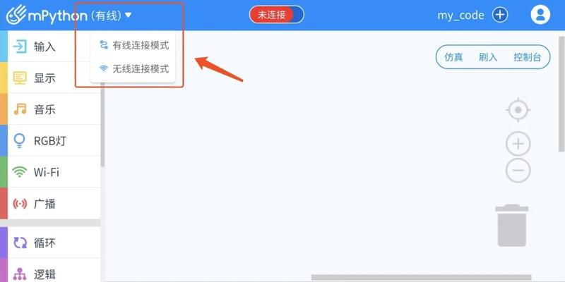 1.首先需要用PC版本的mPython软件在掌控板中刷入无线编程固件: