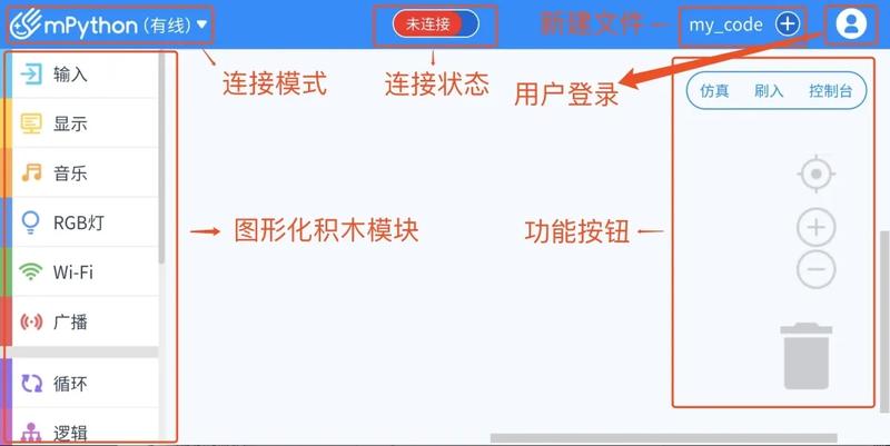 【图形化积木模块区域】:可随心拖动您需要的积木模块来进行图形化编程;