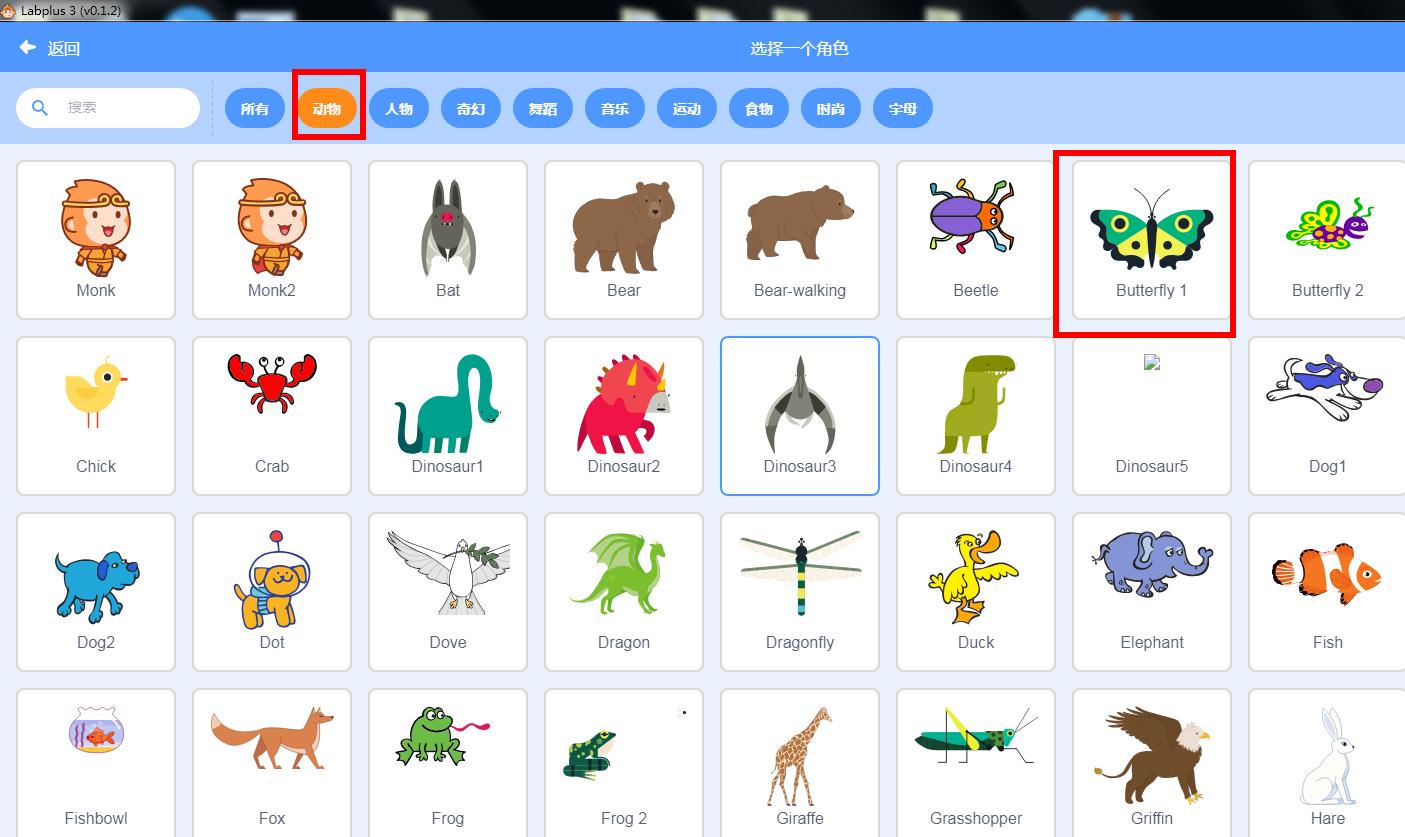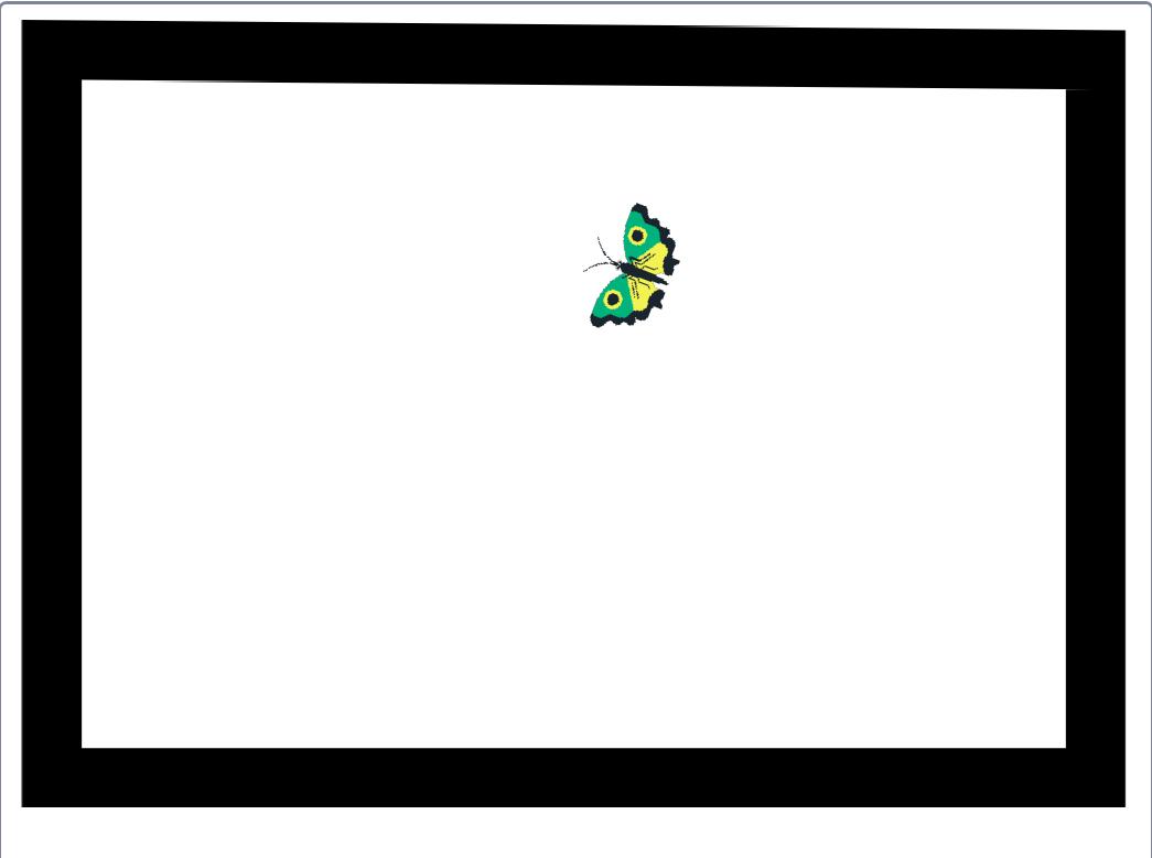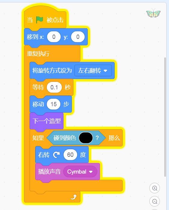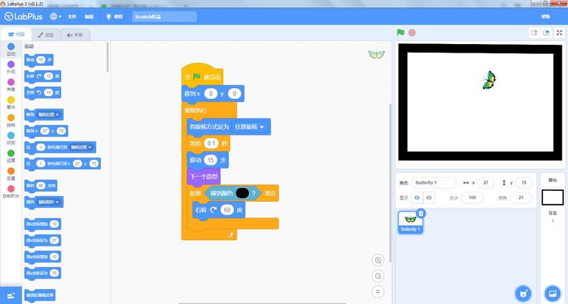 舞台上有黑色边框,蝴蝶自动向前运动时,如果触碰到黑色边框,就会发出声音,并且转向。蝴蝶永远都飞不出黑色边框。(边框自己绘制)