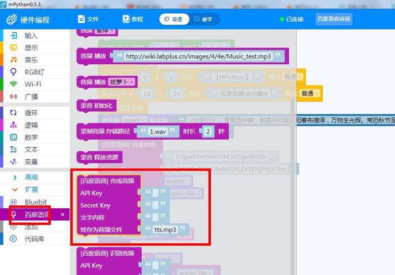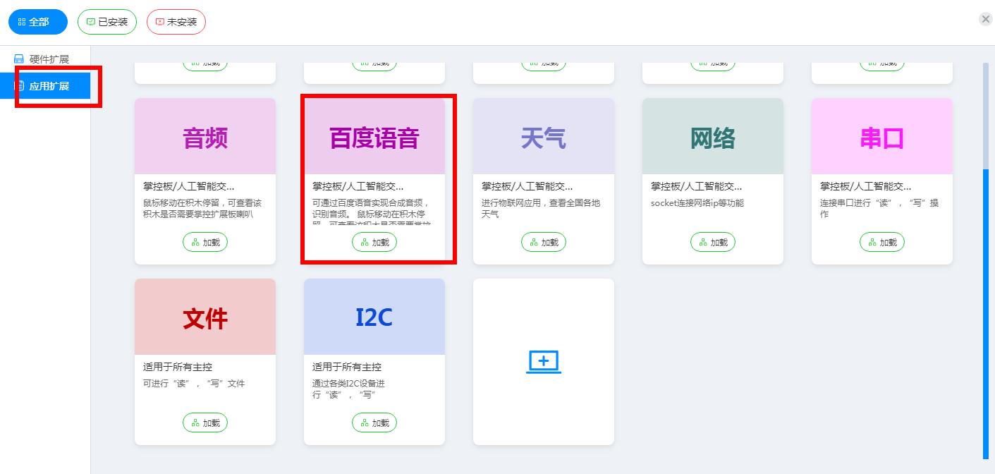 在mPython软件的应用扩展模块中添加指令:百度语音