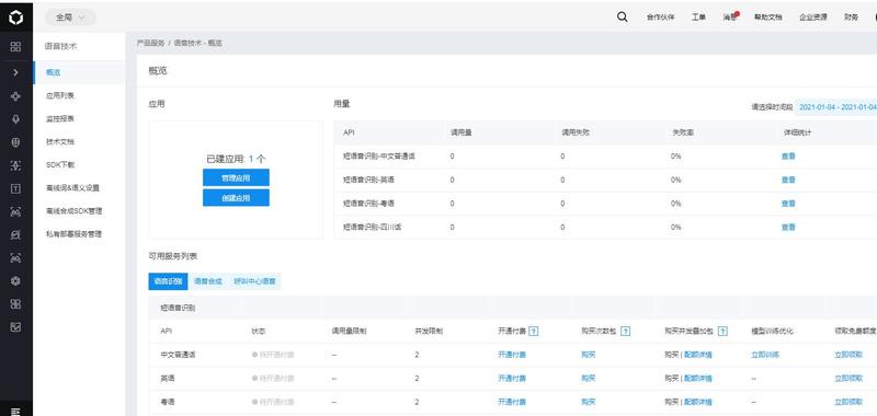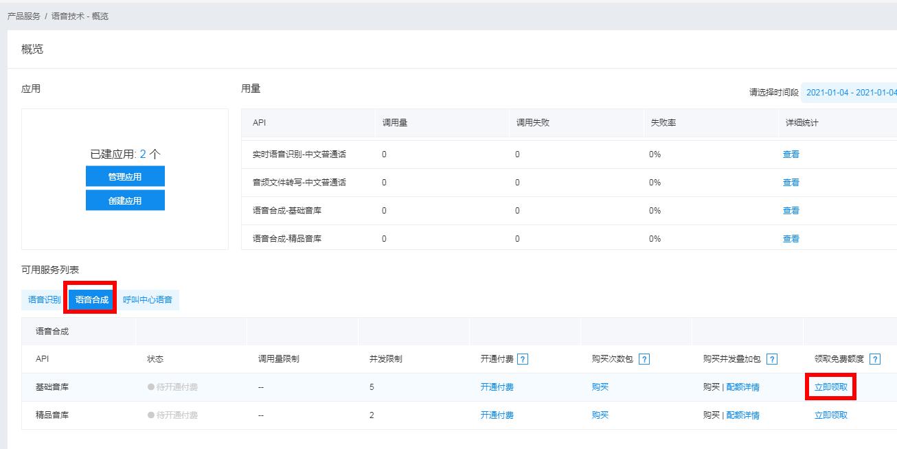 3.语音技术服务产品中,找到语音合成选项,开通基础音库