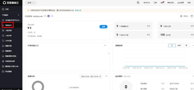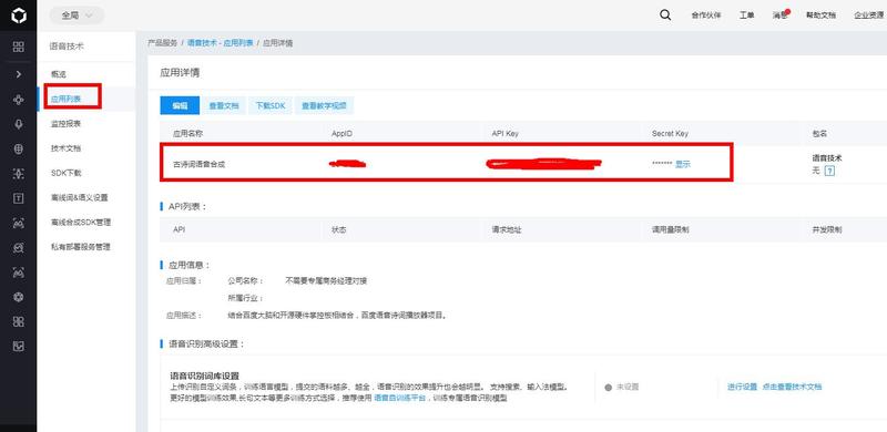 2.在产品服务中,选择语音技术,创建古诗词语音合成。获取API 和Secret