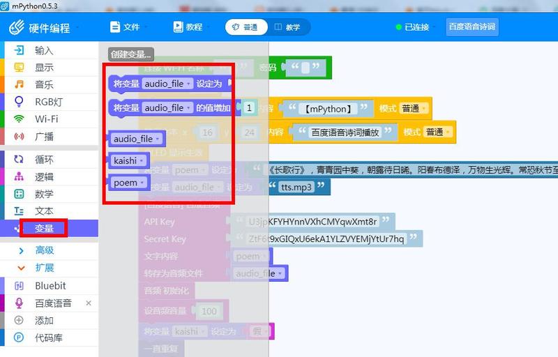 在mPython软件的变量模块中添加变量 kaishi poem aduio。