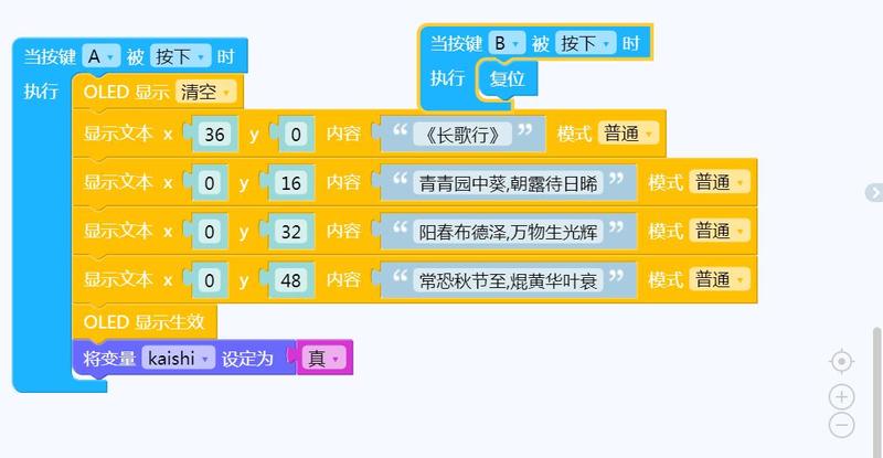 2、当按下掌控板A键,开始播放古诗词,当按下掌控板B键,重新播放,