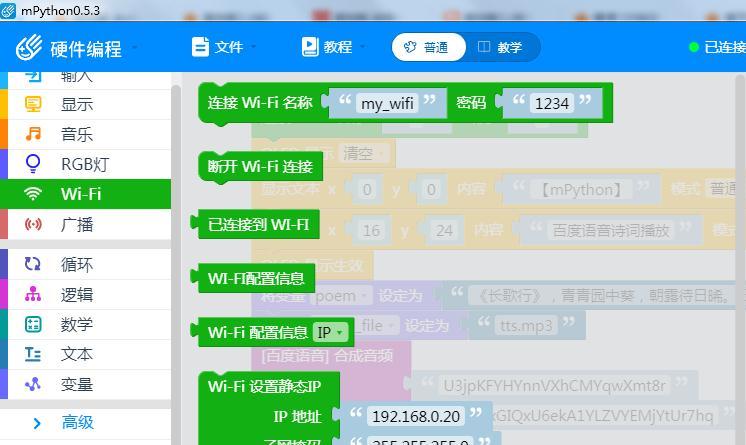 在mPython软件的wifi模块中添加指令:连接wifi指令
