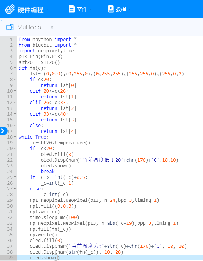 设计想法:一开始想到参考图例的颜色去显示,测试结果不理想。后来就想着通过明显的颜色变化(绿色表示20~25度,蓝色表示26~32度,黄色表示33~39度,红色表示40度以上)来表示不同的温度 #多分支结构的应用