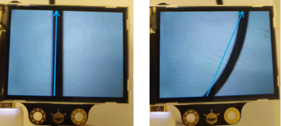 当HuskyLens检测到学习过的线条时(即:同一种颜色的线条),HuskyLens的屏幕上会显示蓝色的箭头,箭头的指向表示路径预测的方向。