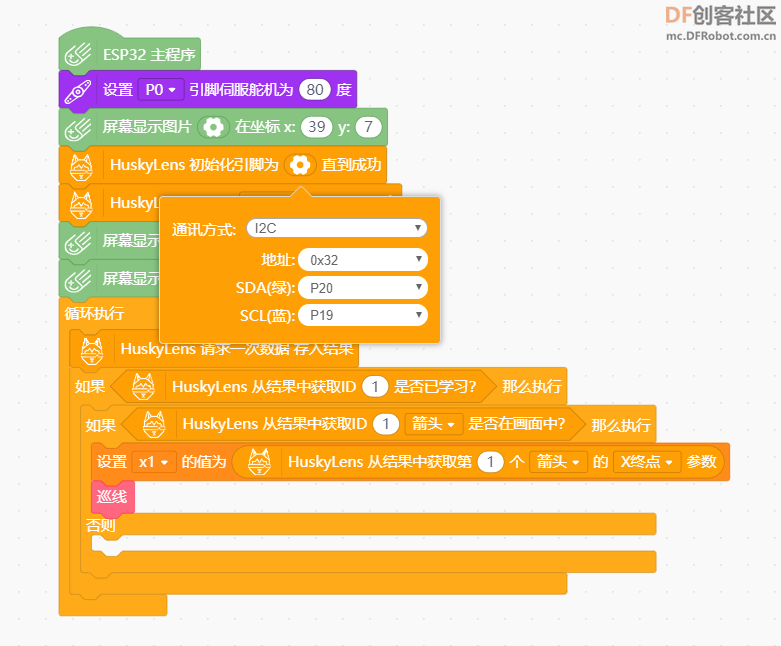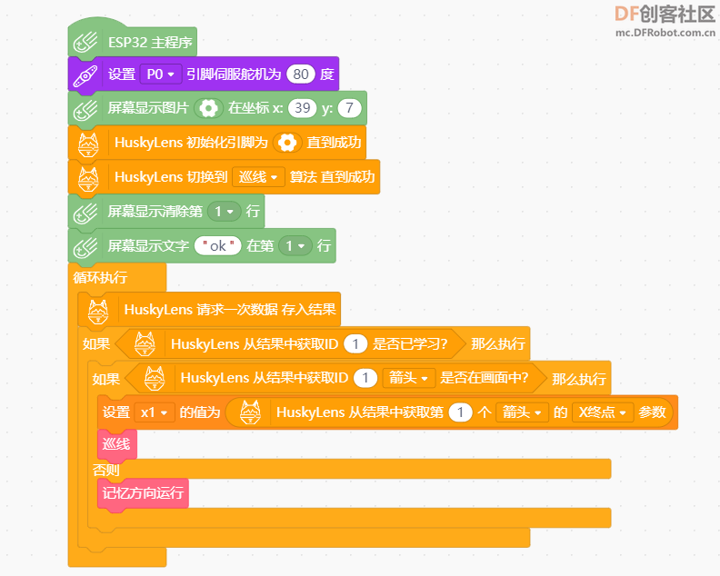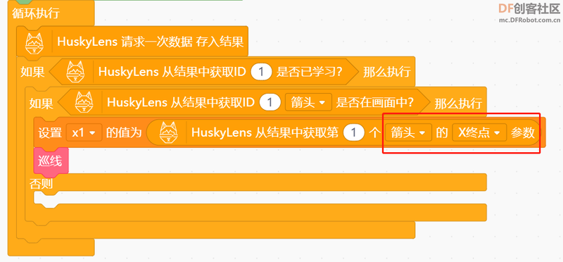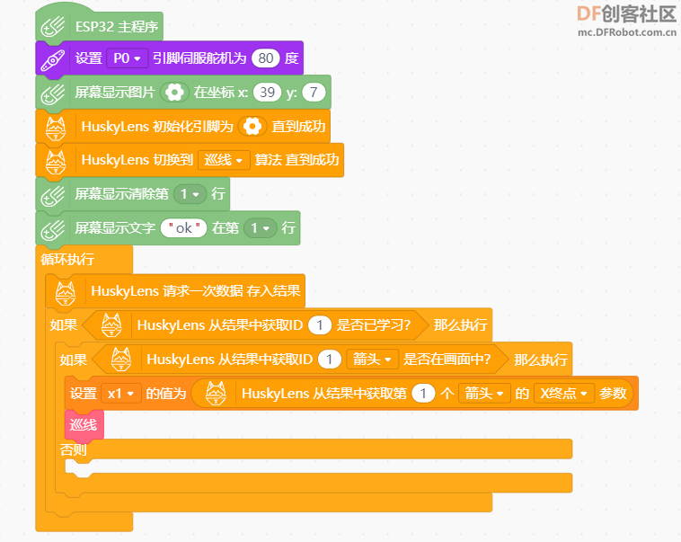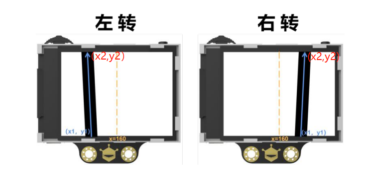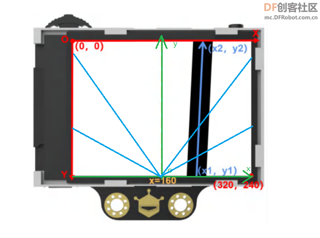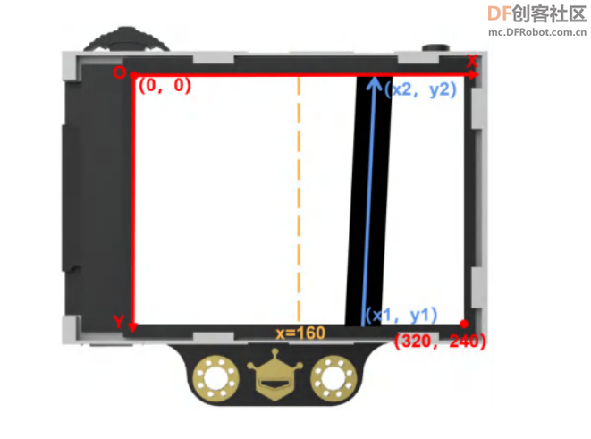 HUSKYLENS 巡线实现逻辑如何让麦昆 plus 在白底黑线的巡线地图上循着黑线运动呢?其实我们只需要知道麦昆 plus 相对黑线是什么位置,分下面三种情况:1、当麦昆 plus 在黑线的偏右位置时,控制麦昆 plus 向左转弯;2、当麦昆 plus 与黑线相对居中时,控制麦昆 plus 直行;3、当麦昆 plus 在黑线的偏左位置时,控制麦昆 plus 向右转弯。具体应该怎么实现呢?我们将 HuskyLens 在巡线过程中屏幕上显示的信息剥离出来,抽象成下图的几何数学模型。HuskyLens屏幕的分辨率是 320×240,屏幕左上角的O点为屏幕的坐标原点(0, 0),水平向右方向为 X 轴正方向,竖直向下方向为 Y 轴正方向,因此屏幕右下角的坐标为(320, 240)。上图中橙色虚线为屏幕的中轴线,这条线的横坐标值为160。上图屏幕中黑色的线,是 HuskyLens 摄像头“看到”的巡线地图线条,蓝色箭头为 HuskyLens 计算出来的线条方向,蓝色箭头的起点坐标为(x1, y1),终点坐标为(x2, y2)。