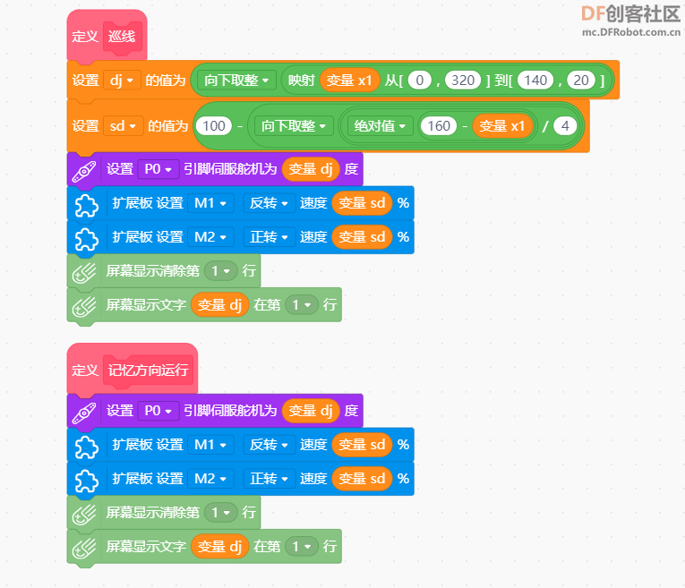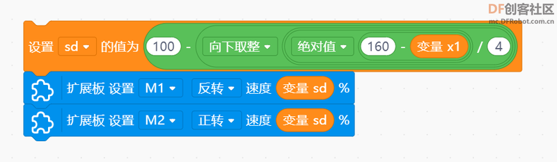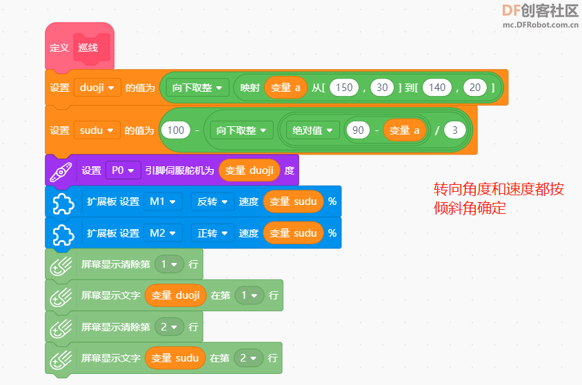 电机的速度扩展库中李亮工程师用百分比来处理,所以用100-前述绝对值的1/4来实现弯度越大(绝对值大)速度越小。