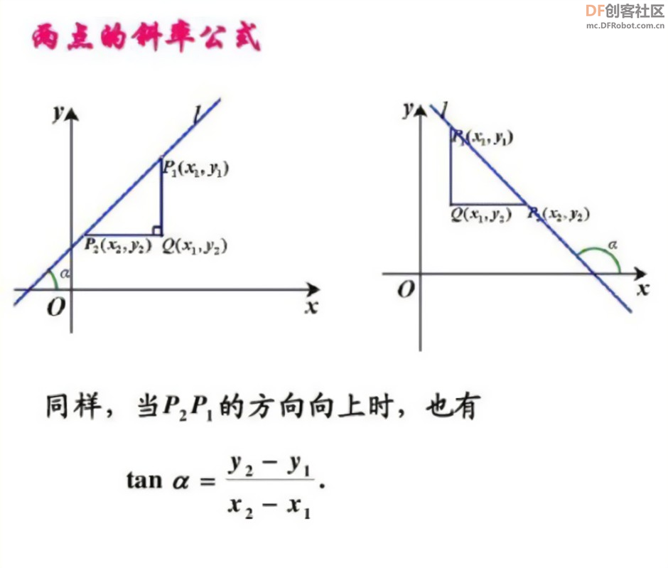 在上图中可以看到,如果用绿色坐标系,就可以完美对接数学一次函数知识,我们要求出二哈屏幕中的箭头终点(x2,y2)和原点(0,0)两点连线所成直线的斜率。