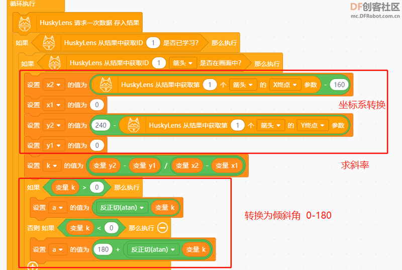 再由斜率和反正切函数求出倾斜角,然后由倾斜角来定义小车转弯的角度和运行速度。