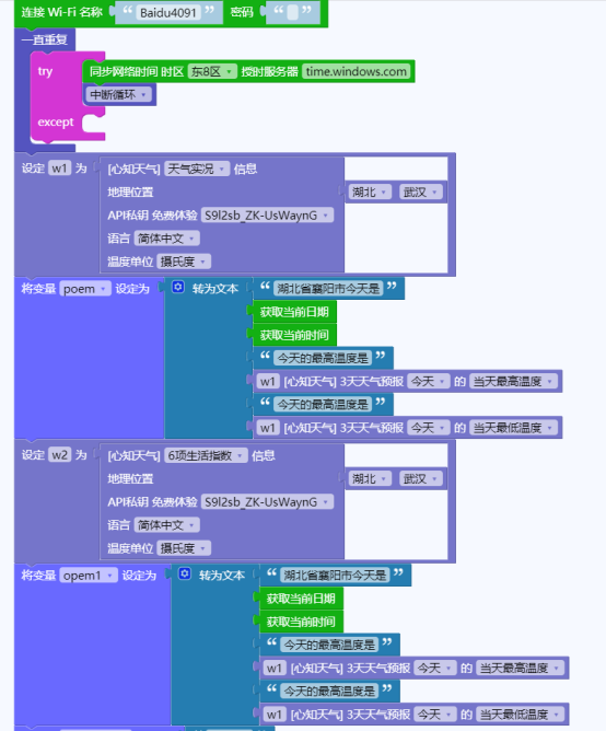(2)mpython环境下编写程序,设置Wifi,获取“心知天气”提供的气象实况与6项运动指数。通过输出观察返回值。