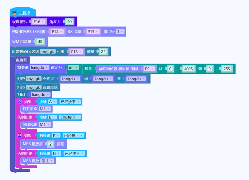 Ⅰ.传感器采集数据及控制器执行家居设备控制——根据传感器采集的数据控制执行器,如通过旋转旋钮电位器不同的角度,控制灯光的亮度,用按键控制音乐的播放和停止。程序设计与电路连接如下图所示。