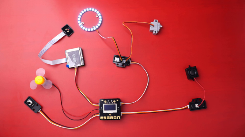 实验设备与模块:乐动掌控*2、AI摄像头、旋钮电位器*1、风扇*1、光环板*1、MP3*1、马达*1、舵机*1、分支模块*1