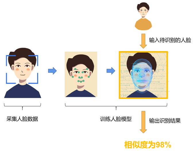 人脸识别应用的实现过程包括人脸的记忆过程和人脸的识别过程,具体主要包括采集人脸数据、训练人脸模型、输入待识别的人脸、输出识别结果四个环节。
