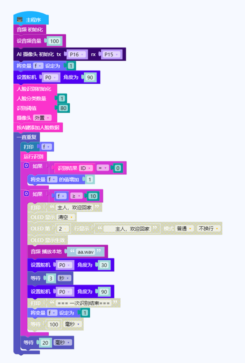 任务介绍:使用AI摄像头上的人脸识别来打开门禁,实现识别到主人后发出语音“主人,欢迎回家”,并且打开灯光和音乐的效果。